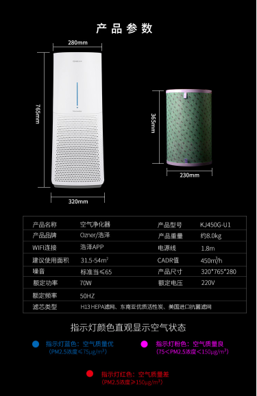 浩泽(ozner) 空气净化器家用除雾霾甲醛PM2.5异味烟尘KJ450G-U1 白色