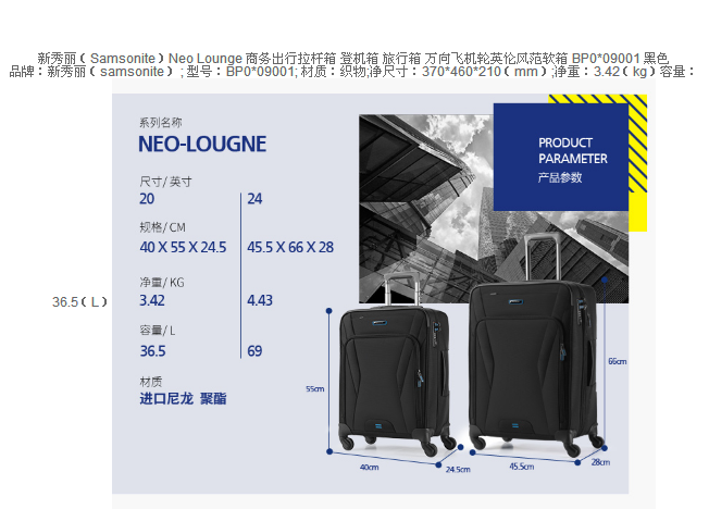 新秀丽(Samsonite)Neo Lounge 商务出行拉杆箱 登机箱 旅行箱 万向飞机轮英伦风范软箱 20英寸 黑色