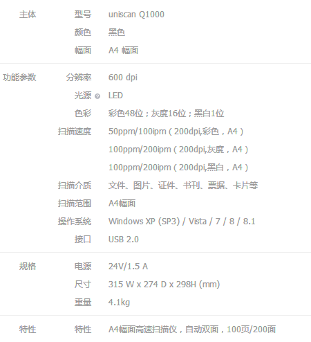 紫光(UNIS)uniscan Q1000 双面高速扫描仪