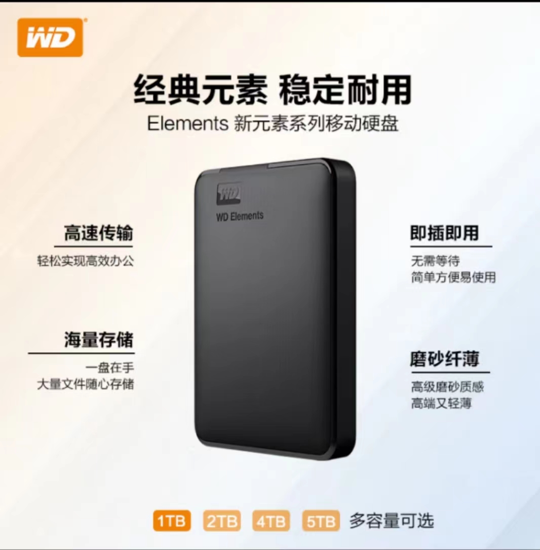 西部数据(WD) 1TB 移动硬盘 USB3.0 Elements SE 新元素系列2.5英寸 机械硬盘 外置存储 手机笔记本电脑外接